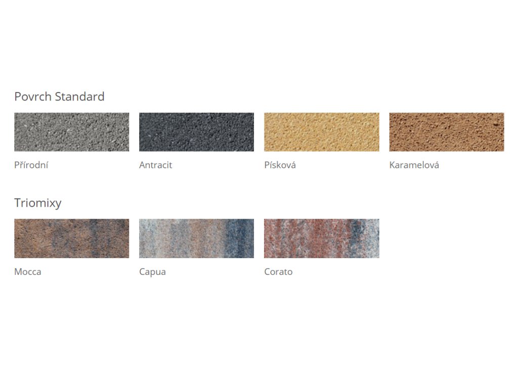 - nášlapová vrstva je již při výrobě ošetřena speciální hydrofobizační přísadou, která výrazně přispívá k utěsnění kapilár a omezuje tvorbu výkvětů. Takto ošetřená dlažba je odolnější proti znečištění a snadno se udržuje.