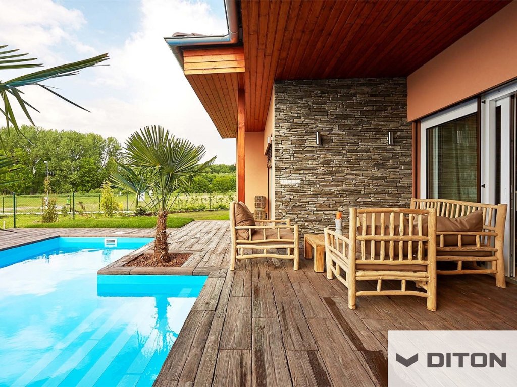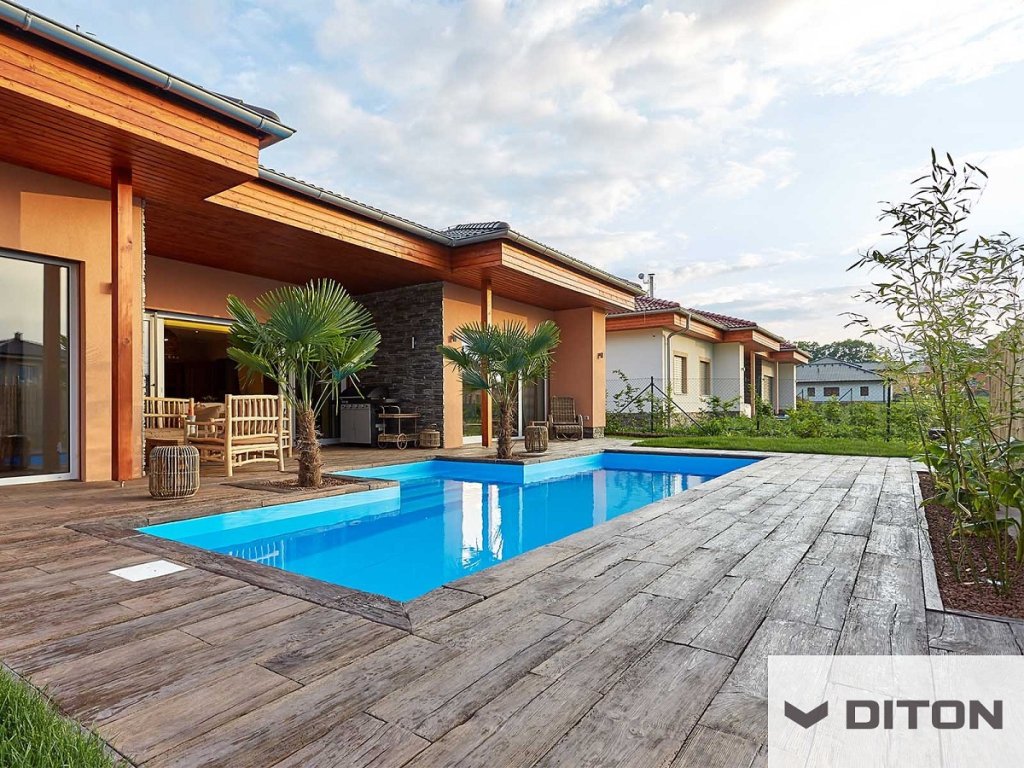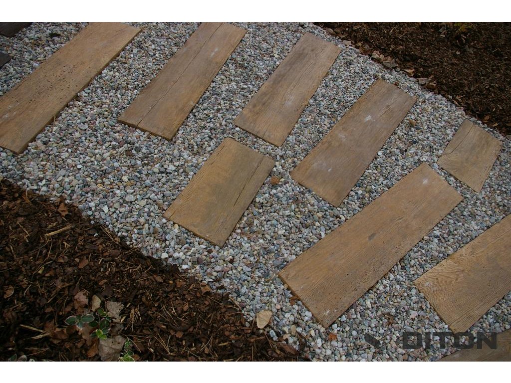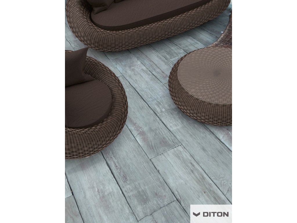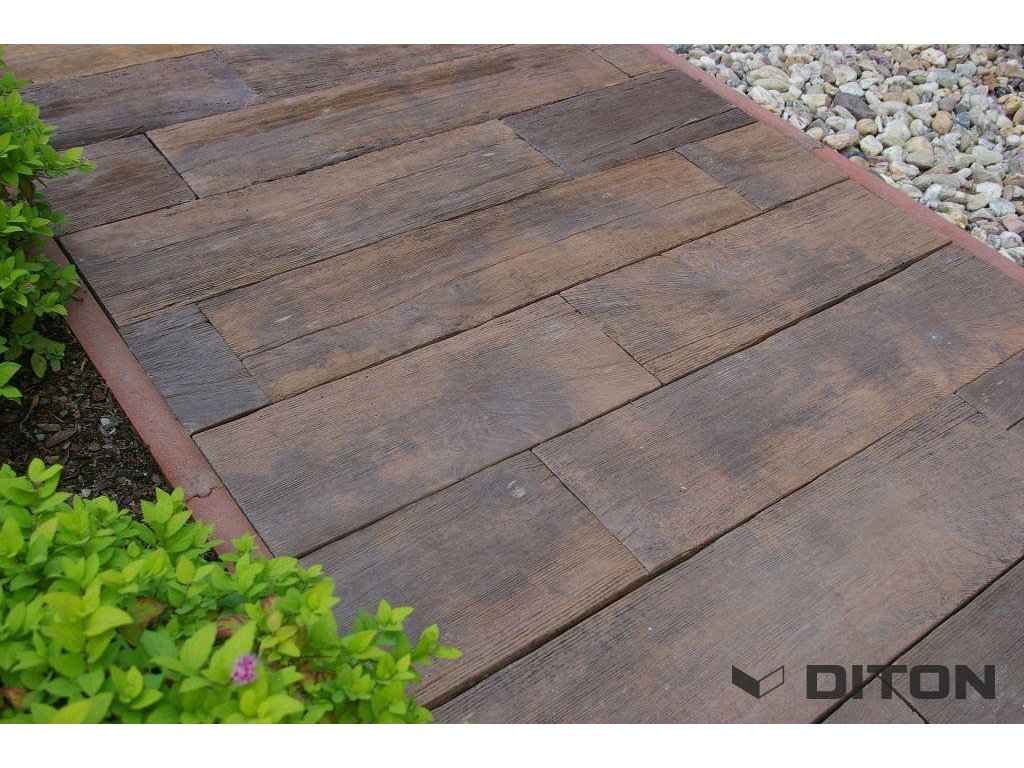 Diton prkno smrk S2 45x22,5x5cm - Betonová litá prkna SMRK s dokonalou imitací dřeva jsou vyráběna ve dvou délkách (450 a 900 mm) a třech barvách (smrk arktic, smrk světlý a smrk tmavý). Jejich výška je 50 mm a šířka 225 mm. Imitovaná dřevěná prkna jsou vyráběna speciální technologií, kdy je celoprobarvený beton lit do forem, což dodává výrobku unikátní vzhled dřeva. Litá betonová prkna Diton s imitací dřeva se používají na pochozí komunikace, tedy na zpevněné plochy, chodníky a chodníčky zahrad, kde tvoří dokonalý doplněk vegetačních ploch a samotného obydlí. Prkna s imitací povrchu SMRK je možné vzhledem k jejich jemnějšímu reliéfu použít jako lemy bazénu. Povrch prkna nám zajišťuje dobrou odolnost proti smyku/skluzu a zároveň jemnější reliéf umožňuje příjemnou chůzi bosou nohou.