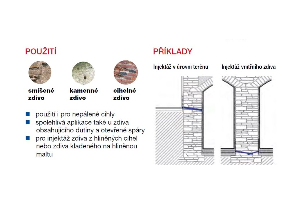 hydrofobizující, bez rozpouštědel, obsah aktivní složky 80%, velmi dobře penetruje, vysoká vydatnost, optimální pro beztlakou infúzi, nízke zatížení zdiva další vlhkostí, vhodné pro zasolené zdivo.