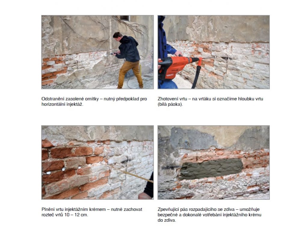 Aplikuje se do zdiva pomocí vrtů. Výška vrtů je vně zdiva nad úrovní terénu, uvnitř ve výšce podlahy. Podle toho, která úroveň je výše. Vrty vrtejte vodorovně nebo mírně šikmo, nejlépe do druhé ložné spáry ve zdivu. Plnění vrtů se provádí pomocí trubice vhodného průměru napojenou na hadici postřikovače.Trubice se vsune co nejhlouběji do vrtu, aby se celý vrt rovnoměrně vyplnil. Během plnění se trubice volně vytahuje ven z vrtu. Vzdálenost injektážích vrtů je 12 cm, s průměrem od 12 do 20 mm. Hloubka vrtu je -2cm celkové tloušťky zdiva. Před naplněním krémem je nutné vrty vyčistit od prachu po vrtání a spáry ve zdivu očistit drátěným kartáčem. Aplikace krému je možná až do 95 % zavlhčení zdiva.