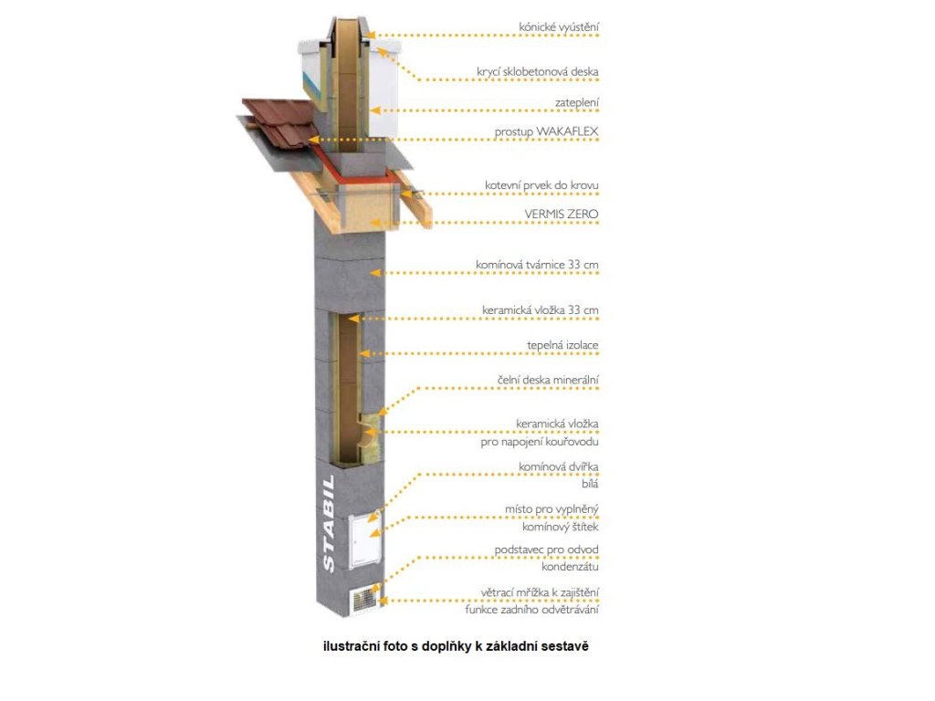 Komínová sestava Stabil obsahuje: komínové tvárnice, komínové vložky, izolační rohože, komínová vložka pro kouřovod 90°, komínová vložka pro dvířka, základní souprava, krycí deska sklobetonová (přesah 2cm), kónické vyústění.