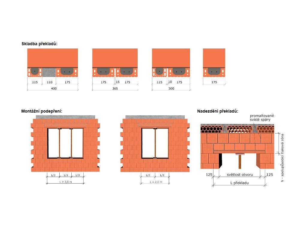 Montážní postup: Při osazování překladů, zejména větších délek, dochází k pružnému průhybu, který výrobek nepoškozuje. Nalomené nebo jinak vážně poškozené překlady se nesmějí zabudovat! Před započetím nadezdívání (nadbetonování) je bezpodmínečně nutné překlady podepřít do roviny tak, aby vzdálenosti mezi podporami nebyly větší než 1 m.