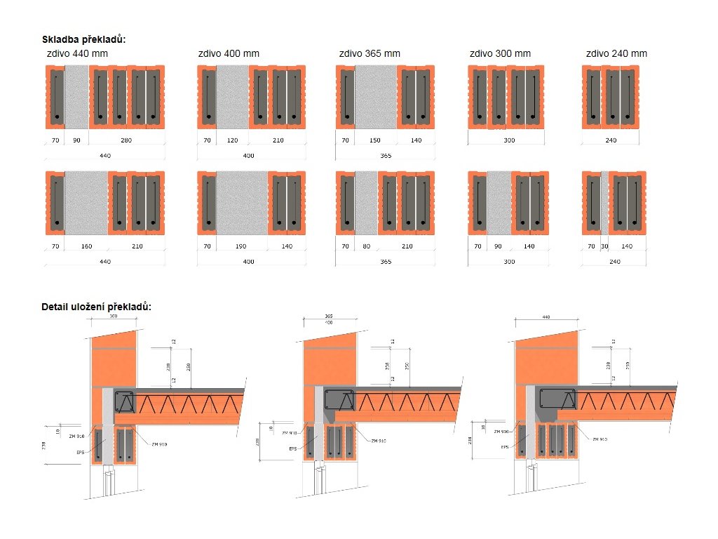 Použití: KMB překlady 70/238 se používají jako plně nosné překlady nad okenními a dveřními otvory ve vnějších i vnitřních stěnách.Vyrábí se v délkách 1 000–3500 mm v modulu po 250 mm.