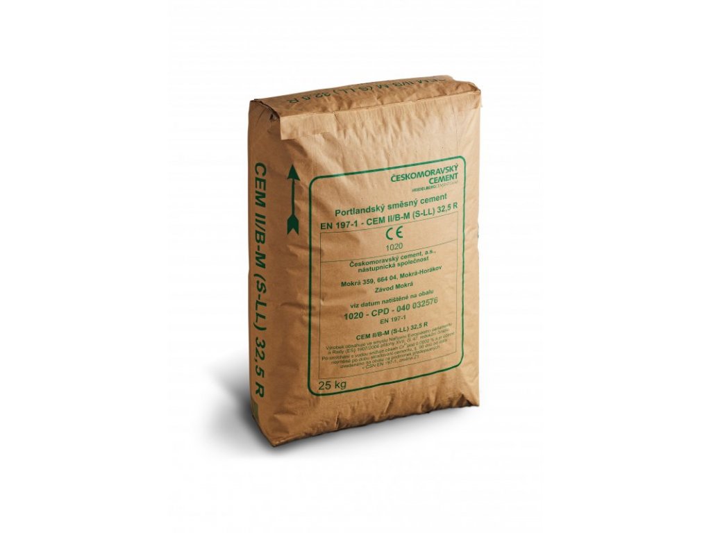 Popis portlandského směsného cementu: cement je hydraulické pojivo, tj. jemně mletá anorganická látka, která po smíchání s vodou vytváří kaši, která tuhne a tvrdne v důsledku hydratačních reakcí a procesů. Po zatvrdnutí zachovává svoji pevnost a stálost také ve vodě. Portlandský směsný cement (S-LL) se vyrábí semletím portlandského slínku, granulované vysokopecní strusky, regulátoru tuhnutí, případně doplňujících složek či přísad usnadňujících výrobu nebo upravujících vlastnosti cementu. Použití portlandského směsného cementu: Cement portlandské typu 32,5 má široké možnosti použití - výroba obyčejného, těžkého a lehkého betonu a masivních betonových konstrukcí, opěrných stěn; pro stavby ve vlhkém prostředí a stabilizaci zemin v dopravním stavitelství atd. Tento cement se používá pro betonáže velkých objektů z důvodu nižšího vývinu hydratačního tepla. Betony s portlandským struskovým cementem mají zvýšenou odolnost proti agresivnímu prostředí při zachování vysokých pevností, proto má portlandský struskový cement široké uplatnění na všech stavbách a při výrobě